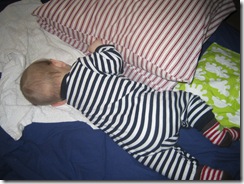 Här är Alfreds nya sovställning. Han ligger inte direkt still längre, ibland när jag kommer in i sovrummet ligger han som Pippi Långstrump med fötterna på huvudkudden...